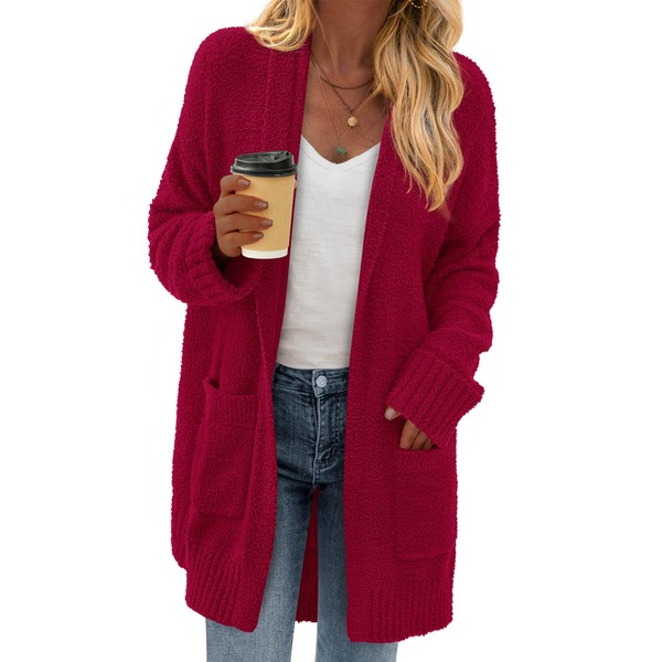 KIRUNDO Cardigan Sweaters for Women 2025 Fall Chunky Fuzzy Knit Open Front Loose Long Sleeve Sweater Coats Winter Clothing(Burgundy, Large)