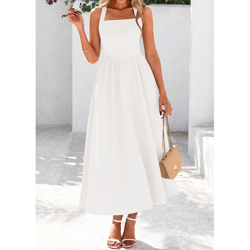 Features: Halter Neck, Long Length, Sleeveless, Square Neck, Ruched Back, Drop Elastic Waist, A Line, Swing, Flowy, Solid Color,Trendy Summer Dress