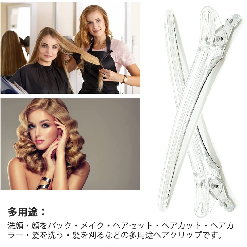 • Hair Clip Materials and Dimensions: Made of polycarbonate resin, steel, and aluminum, this hair clip is lightweight, strong, sturdy, and durable.Thanks to its durable materials, it is rust and crack resistant.The weight of 1 hair clip is 0.4 ounces (10 g).Professional-grade duck curl dimensions (depth x height): 4.8 x 0.6 inches (12.3 x 1.4 cm).Color: Clear.Packaging: 6 pieces included