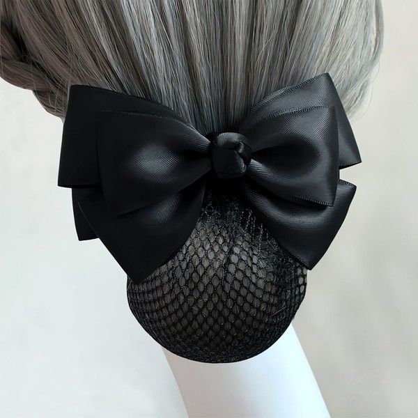 KISARG バレッタ シニヨンネット付き お団子ネット レディース ヘアアクセサリー 女性 まとめ髪 髪留め 髪飾り ヘアアレンジ リボンおしゃれ 接客フォーマル オフィス ブラック (三重リボンー細い網)