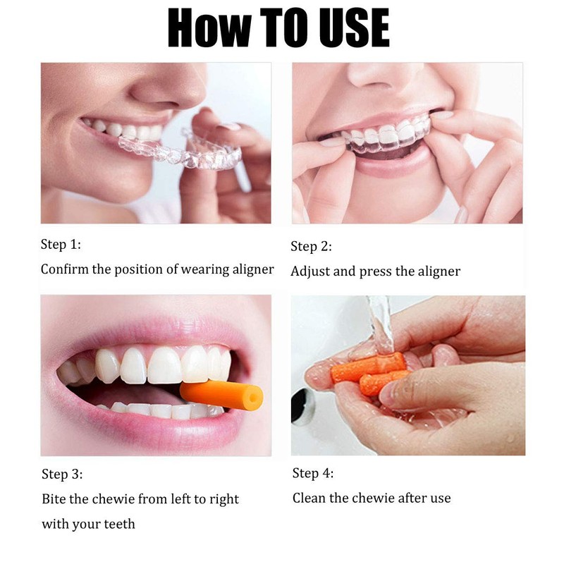 - Easy to Use: Step 1: confirm the position of wearing aligner, step 2: adjust and press the aligner, step 3: bite the chewie from left to right with your teeth, step 4 clean the chewit after use.