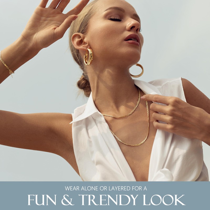 - Elevate your style - Add our 18k Gold plated Sterling Silver Curb necklace to your wardrobe. The flat diamond-cut links create a rich shine, offering a modern edge to any outfit. Slim and durable at 3.5mm, it's perfect for daily wear. Whether worn solo for a polished look or stacked for a cool fashion statement, this versatile necklace suits any age and occasion.