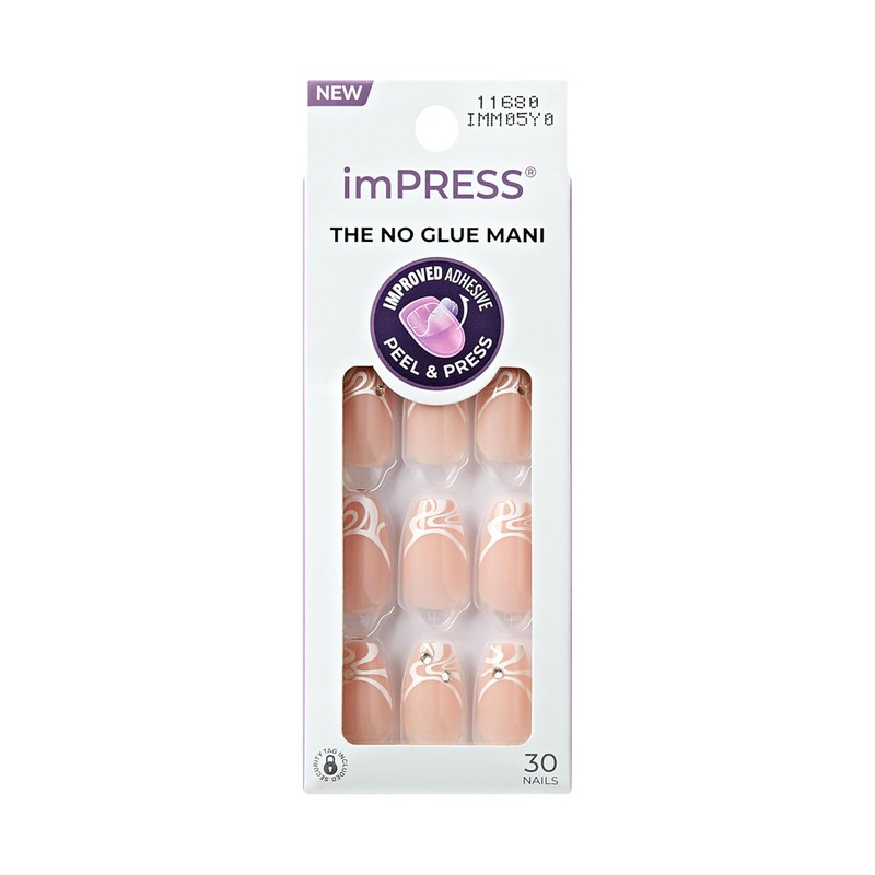 KISS imPRESS No Glue Mani 30 Pcs Press On Nails, Easy Apply, Hassel-Free Removal, Simple Peel & Press, Essential Tools Included, Prep Pad, Instructions Sheet, 1 Manicure Stick, 1 Mini File (Coy)