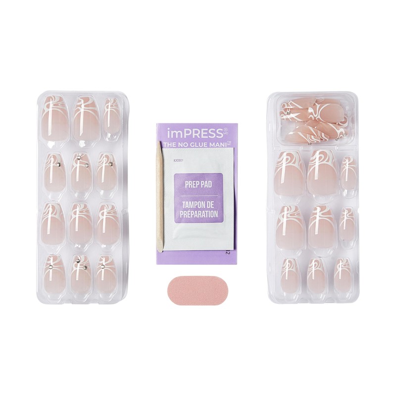 KISS imPRESS No Glue Mani 30 Pcs Press On Nails, Easy Apply, Hassel-Free Removal, Simple Peel & Press, Essential Tools Included, Prep Pad, Instructions Sheet, 1 Manicure Stick, 1 Mini File (Coy)
