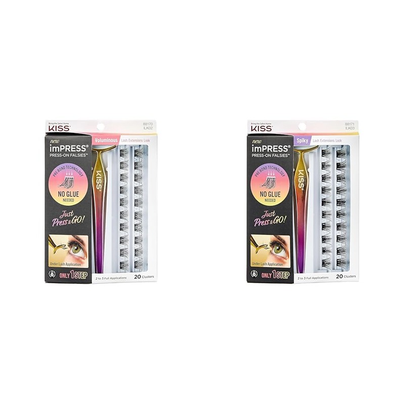KISS KISS imPRESS Falsies False Eyelashes, Clusters, Spiky', 16 mm & Voluminous', 14 mm, 20 Clusters Each, Applicator, Easy Apply