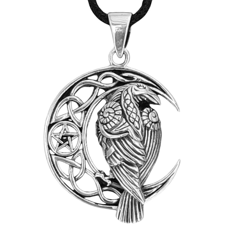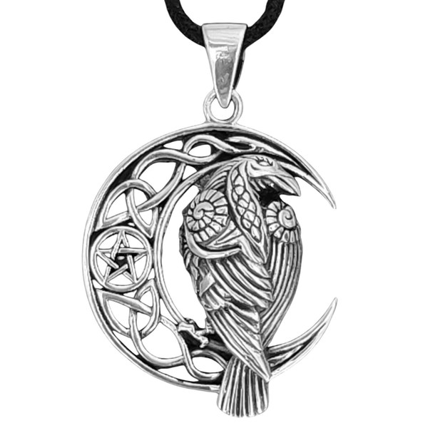 - Artfully designed raven pendant made of 925 sterling silver. The bird sits on a crescent moon decorated with Celtic knots and a pentagram. For men and women.
