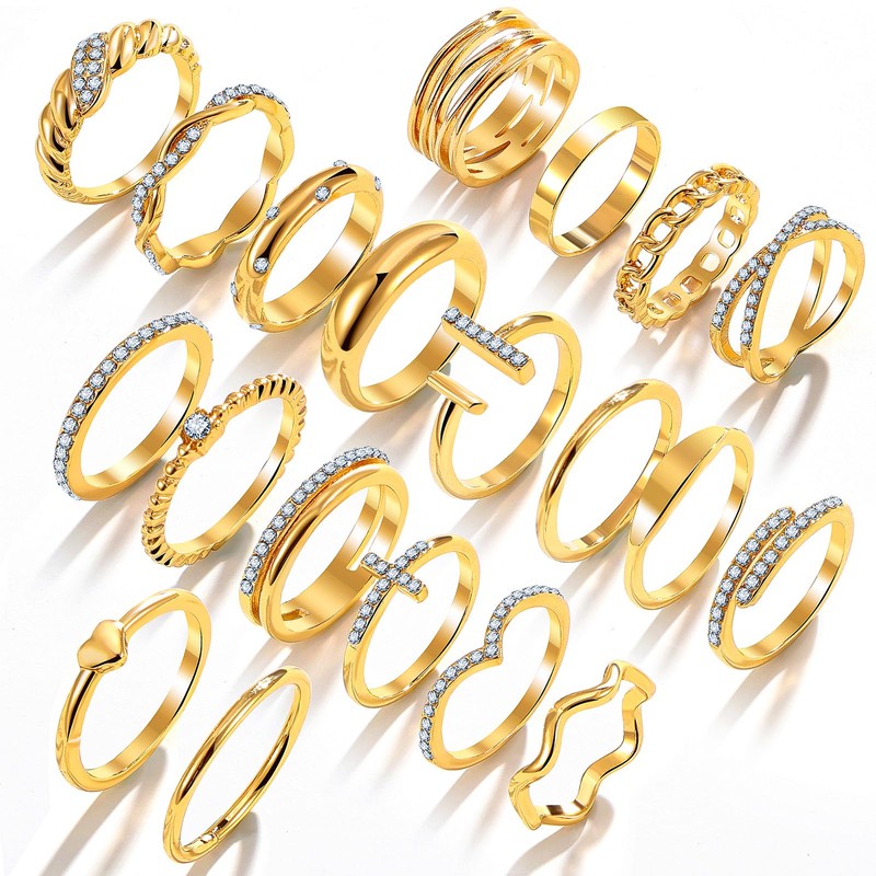 - GOLDEN RINGS PACK: Set contains 20 rings in a variety of styles and a mix of sizes. They can be worn individually or stacked on different fingers. So that you can wear your ring every day without repeating it.