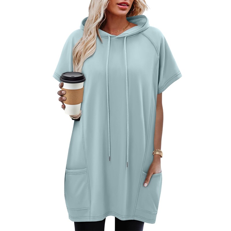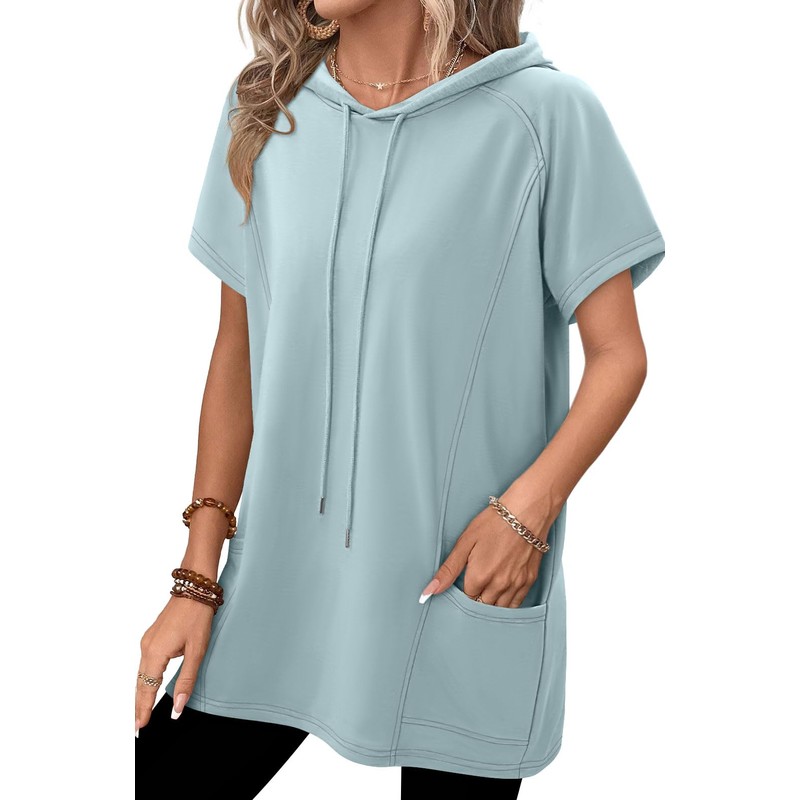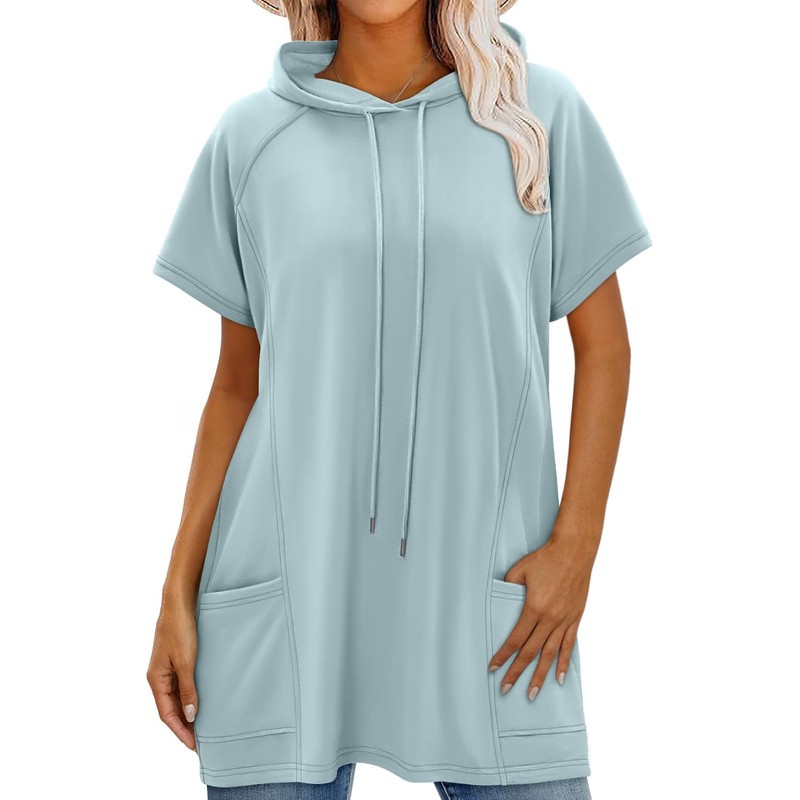 - Design: It's a cute lightweight short sleeve hoodie tunic. Easy to retain shape, deep pockets can carry phone, The hooded design adds a touch of fashionable casualness. lots of colors to choose from