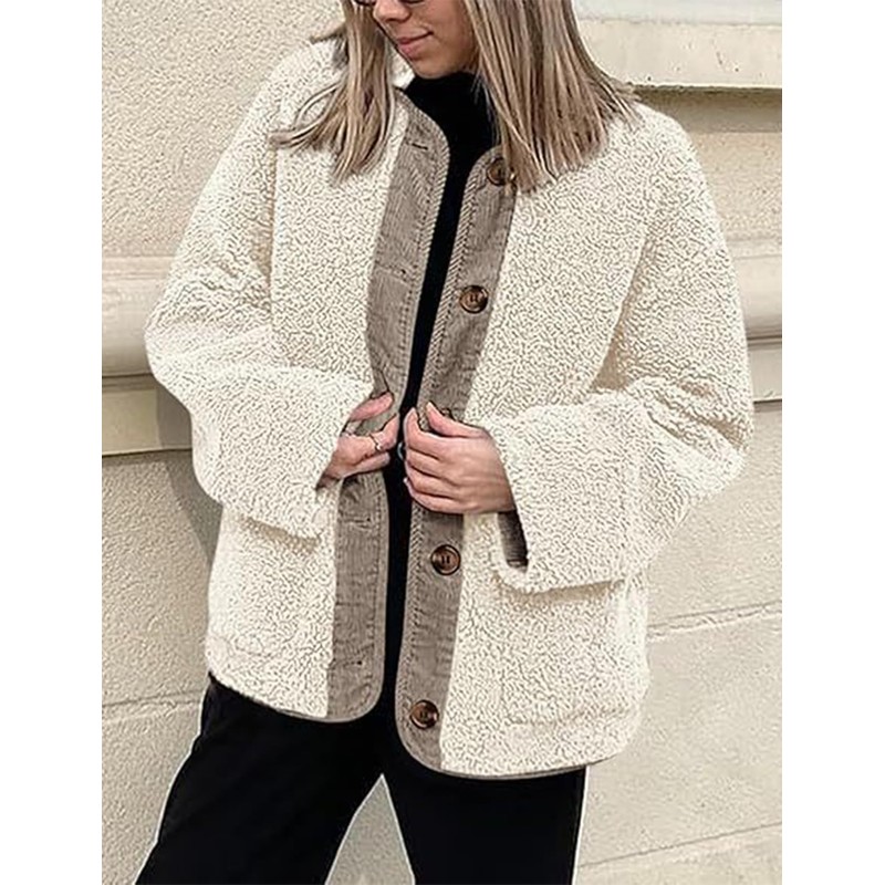 - Sherpa fleece jacket women featured collarless, crew neck, long sleeve, fleece corduroy spliced design, front botton clourse, drop shoulder, two big side pockets, oversized style add a touch of effortless style to your wardrobe.