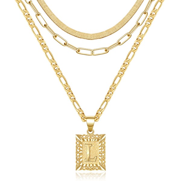 KissYan Gold Layered Necklace Set for Womens, 14K Gold Plated Initial Letter Pendant Necklace Paperclip Snake Choker Silver Alphabets from A-Z Figaro Chain Necklace Jewelry Gift (Gold L)