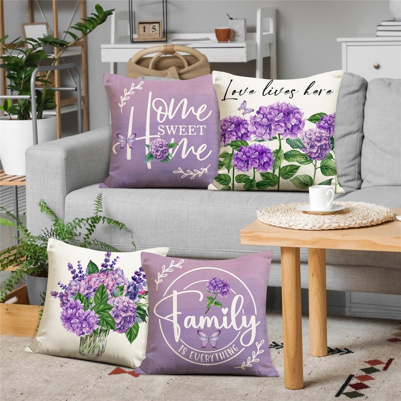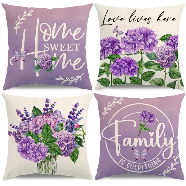 KISVODS Spring Pillow Covers 18x18 Purple Spring Summer Farmhouse Decorations Hydrangea Vases Butterfly Throw Pillow Covers Home Sweet Home Cushion Case for Sofa Couch Set of 4