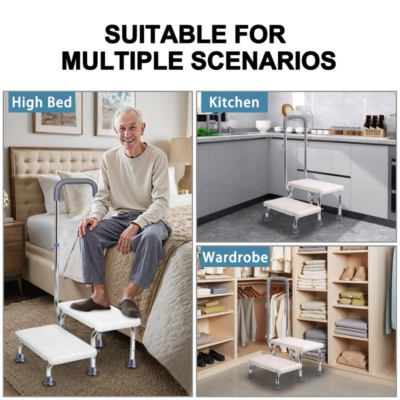 2 Step Stool with Handle for Elderly - Non-Slip Bedside Steps with Adjustable Handrail (450 lbs Capacity)