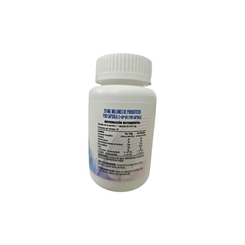 Contiene probióticos (L. Rhamnosus y B.Longum 1x10^10 UFC c/u) y prebióticos (Inulina de Agave).