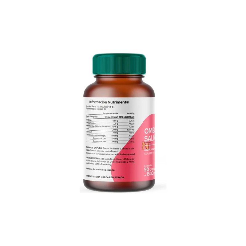 Cada cápsula contiene: 1000 mg de aceite natural de salmón de origen noruego y 10mg de vitamina E (Alfa tocoferol)