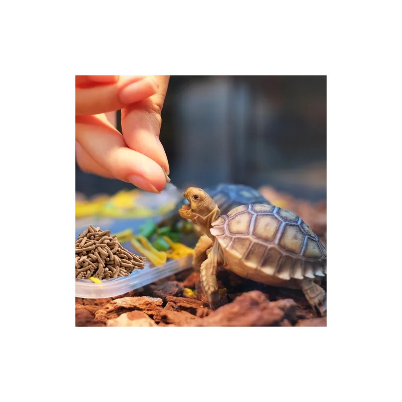 Utilice los productos para el cuidado y alimentación de su tortuga. Coloque varios bites en el tanque de agua. Alimente 2 a 3 veces al día. Coloque 1 a 2 larvas en el comedero por día. No exceder. Como preventivo aplique unas gotas de vitamina A en el alimento y ojos de sus tortugas 2 veces por semana. Para desinflamar las membranas de los parpados, aplique primero aclarador para ojos, espere y aplique una gota de vitamina A en cada ojo. Utilice el suplemento de calcio sumergiéndolo dentro del hábitat para que se disuelva.