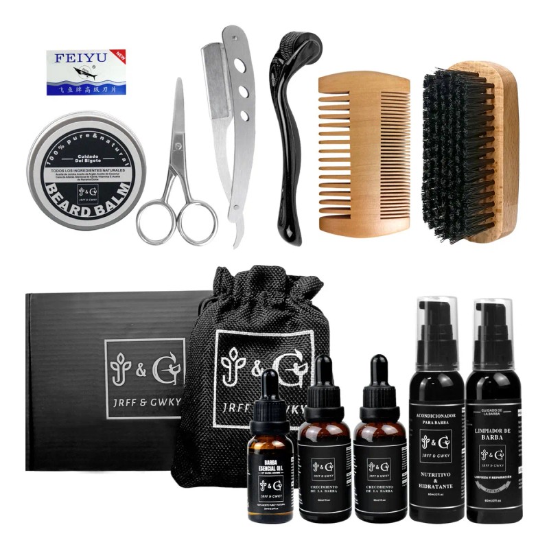 Kit Barba Cuidado Para Regalos Para Hombre 13pcs JRFF & GWKY incluido champú para barba, crema para barba, aceite para barba, peine, cepillo, tijeras, maquinilla de afeitar y bolsa de almacenamiento
