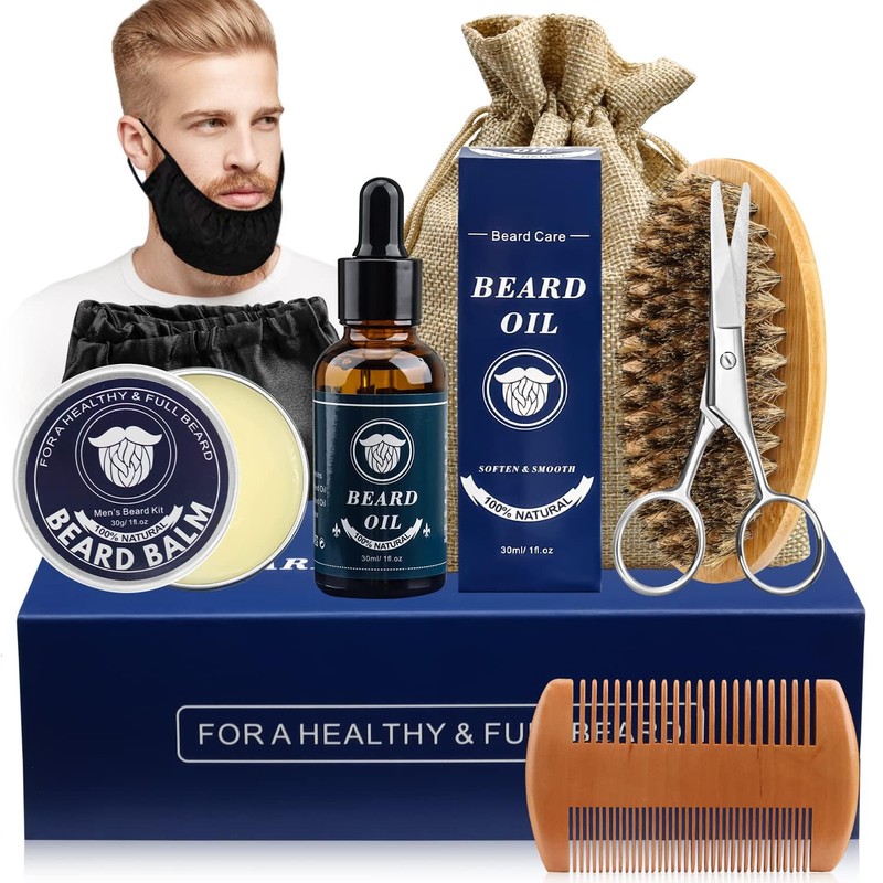 Kit Barba para Hombre, Kit Cuidado Barba Hombre Completo 7 en 1, con Aceite Barba, Balm, Cepillo, Peine, Tijera, Capucha de Barba, Balsamo Barba, Regalo Navidad para Papa, Novio