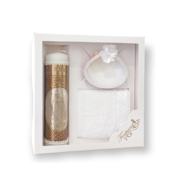 Kit Bautizo en Repujado Apl. Virgen Completa, Cirio, toalla y concha. (Blanco/oro)