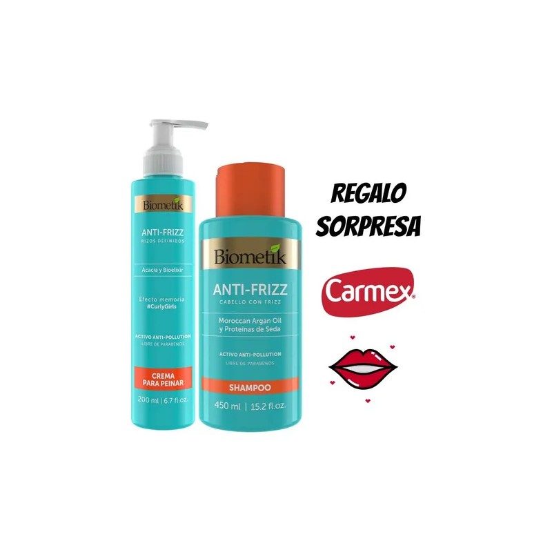 Transforma tu rutina de cuidado capilar con el Kit Biometik Anti Frizz, diseñado especialmente para cabellos con frizz, crespos y ondulados. Este shampoo y crema para peinar brinda limpieza y facilita el peinado, mejorando la manejabilidad de tu cabello, dejándolo suave y sedoso. La fórmula avanzada penetra en la fibra capilar, ayudando a controlar el frizz y proporcionando un acabado brillante.