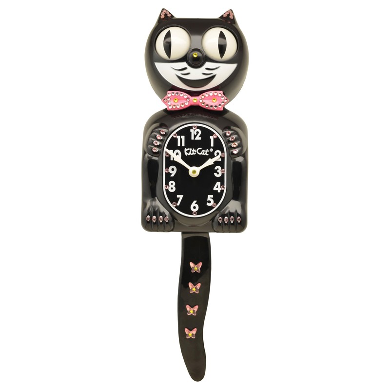 Kit Cat Klock Pink Bow/Butterfly Tail Pink/Yellow Crystals Jeweled Clock