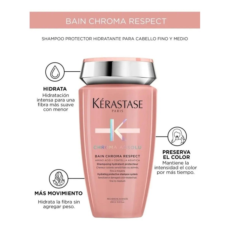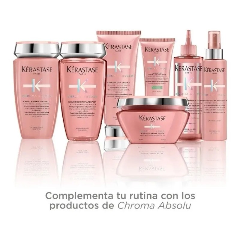 Descubre el poder transformador del Kit Chroma Absolu de Kérastase, diseñado para quienes desean mantener su cabello teñido impecable y radiante. Este dúo dinámico, compuesto por el Shampoo Bain Chroma Absolu y el Acondicionador Fondant Cica Chroma, es la solución definitiva para revitalizar y proteger tu melena.