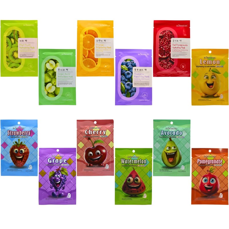 Kit de 12 Mascarillas faciales coreanas surtidas - Frutales - Uva, sandía, granada, naranja, limon, mora, fresa y mas