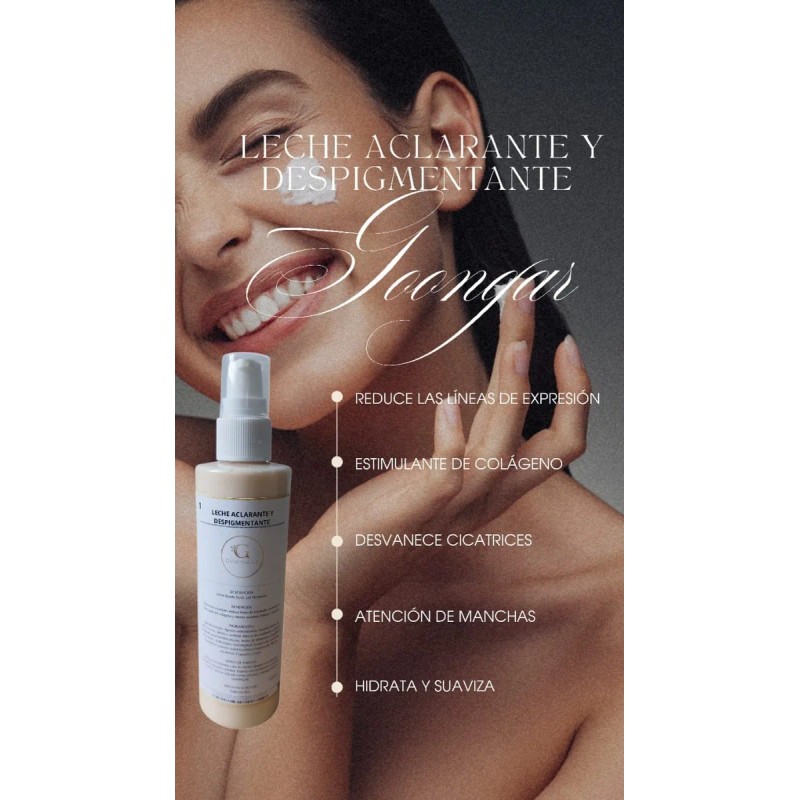 - LECHE ACLARANTE Y DESPIGMENTANTE GOONGAR Leche líquida facial, con PH neutro. BENEFICIOS Desvanece cicatrices, reduce líneas de expresión, estimula la formación del colágeno y atenúa manchas, hidrata y suaviza. INGREDIENTES Agua desionizada, Agentes antioxidantes, Ascorbil fosfato de sodio, Lecitina, Arbutina, sorbitol, Mezcla de emolientes aniónicos, Neopentil glicol dietilhexanoato, Aceite de almendras, Copolimero de acrilatos, Acido Kójico, Etoxidiglicol, Extracto de tamarindo, Fosfolípidos naturales multivitamínico, Conservador libre de parabenos, Fragancia y Color. MODO DE EMPLEO Aplica por las mañanas y por las noches después de la limpieza habitual en pequeña cantidad. Esparce con movimientos circulares. A finalizar reforzar aplicado crema aclarante y despigmentante GOONGAR. FRECUENCIA DE USO Todos los días. 120 ml (4.58 oz.)