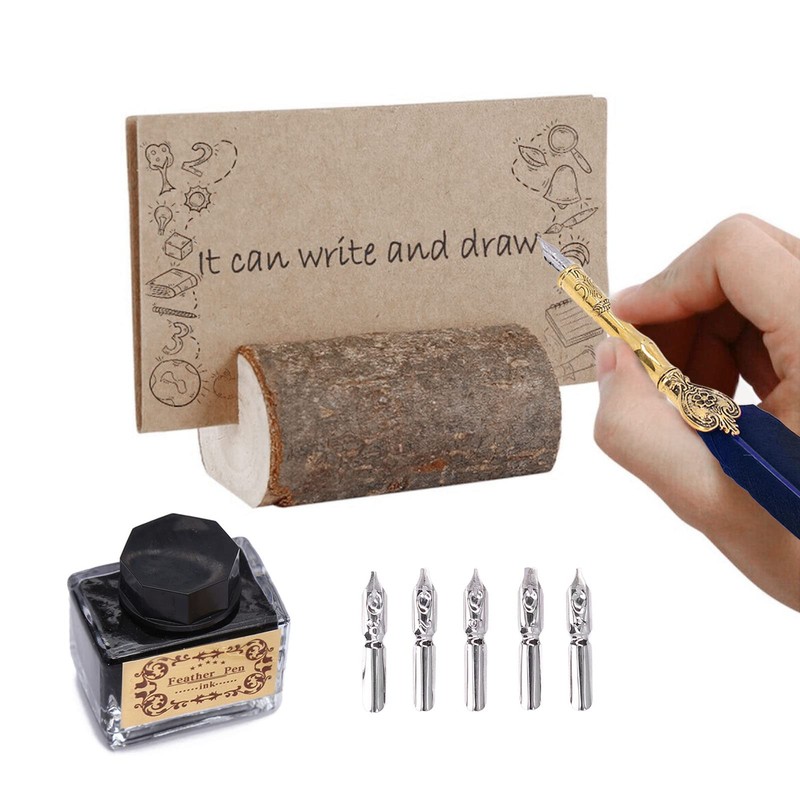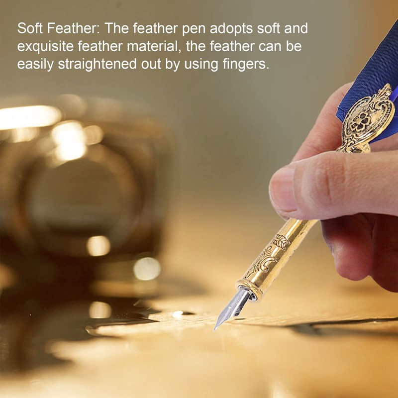 Kit de Pluma de Ave, Pluma de Ave, Pluma de Pluma Retro, Pluma de Acero Inoxidable, Pluma Antigua, Pluma Antigua para Escribir, Dibujar, Firma, Decoración de Boda(azul)