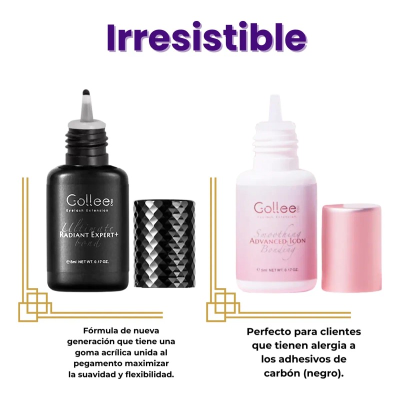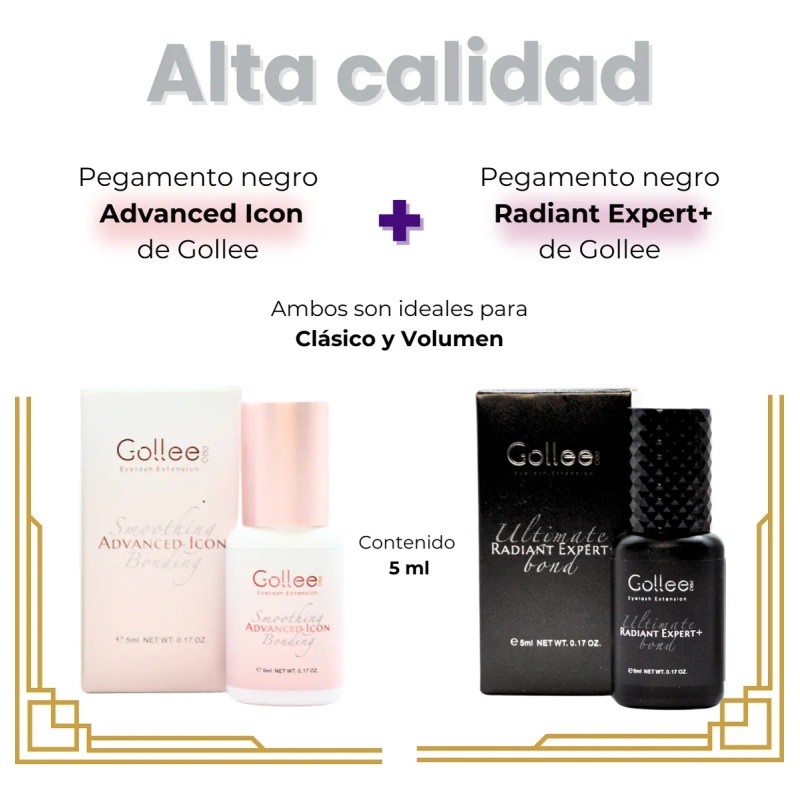 ⚫💖 Kit Gollee Adhesivos P/ Extensiones Pestañas - Negro Profesional + Rosa Transparente ✨ Dúo esencial para lashistas: Incluye 1x Adhesivo Gollee Negro Profesional (5ml, secado 0.5-1s, retención 6-8 semanas, para sets definidos) y 1x Adhesivo Gollee Pink Clear Bonding (5ml, transparente al secar, secado 1-2s, retención 5-7 semanas, ideal para pestañas de color y clientes sensibles). Este kit ofrece versatilidad, máxima retención y baja irritación, permitiendo adaptarse a cualquier necesidad y lograr acabados impecables en la aplicación de extensiones de pestañas. ⚠️ Uso Exclusivo Profesional.
