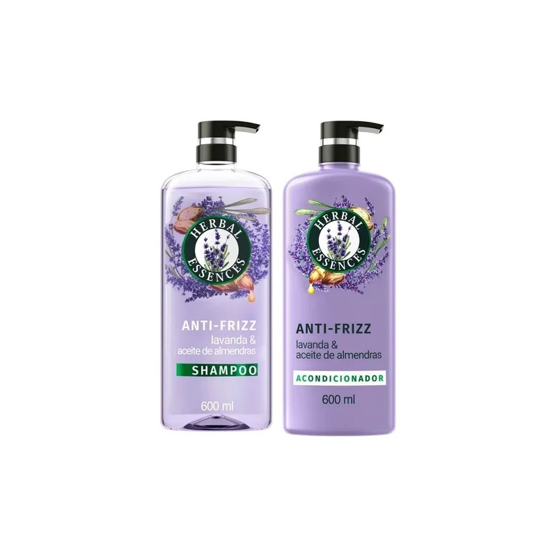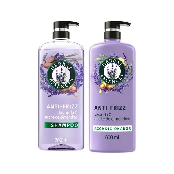 Limpia, hidrata y ayuda a calmar el frizz de tu cabello con el shampoo y acondicionador anti-frizz Herbal Essences Lavanda & Aceite de Almendras, dejándolo suave, manejable y sin frizz. Adecuado para cabello con frizz o con daño leve a moderado. También es seguro para el cabello teñido. Disfruta del aroma real con notas de lavanda, cítricos refrescantes y sándalo. La fórmula con ingredientes inspirados en la naturaleza no contiene parabenos, parafinas ni aceites minerales y no ha sido probada en animales.