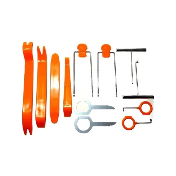 - 12 Piezas Herramienta de desmontaje de audio para automóvil, funciona muy bien para instalar o quitar sistemas de audio o radio de coche, panel de puerta, molduras, emblemas, adornos de ventana o reparación de interiores de automóviles y restauración de muebles.