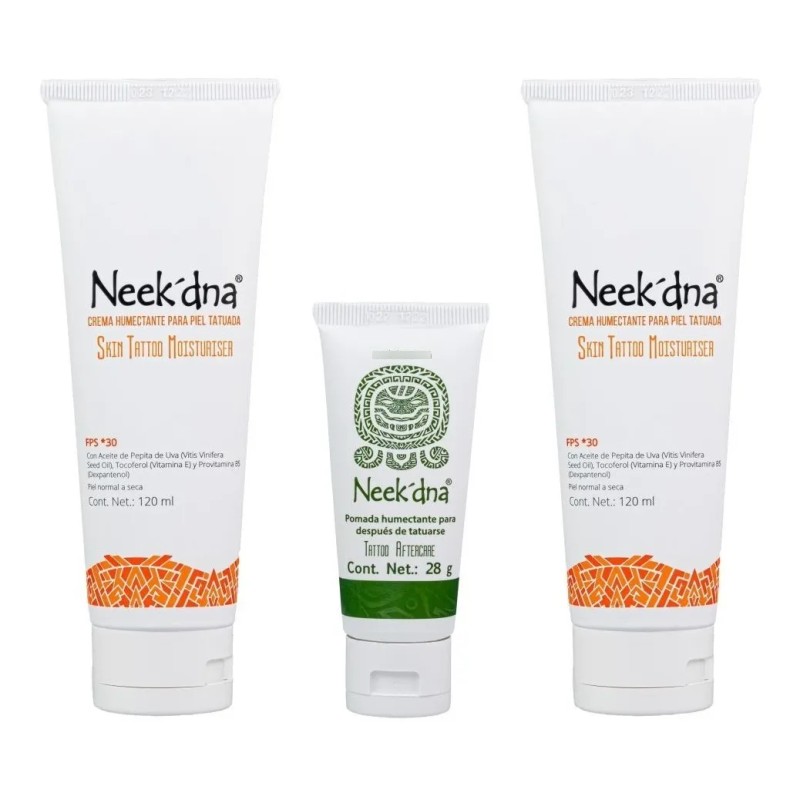 🎨 Dale a tu piel tatuada el cuidado que merece con el Kit Neek'dna, un tratamiento completo de uso diario que hidrata, protege y potencia la apariencia de tus tatuajes. Ideal para piel recién tatuada o con tinta antigua que deseas mantener vibrante y saludable.