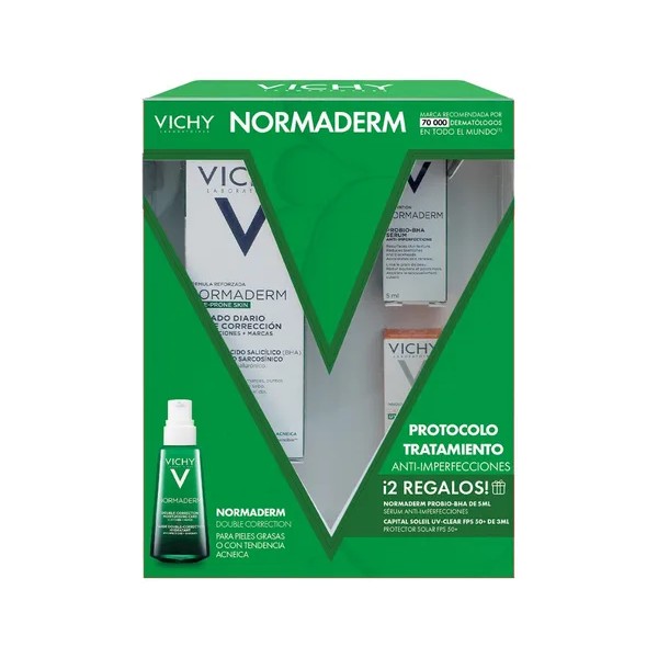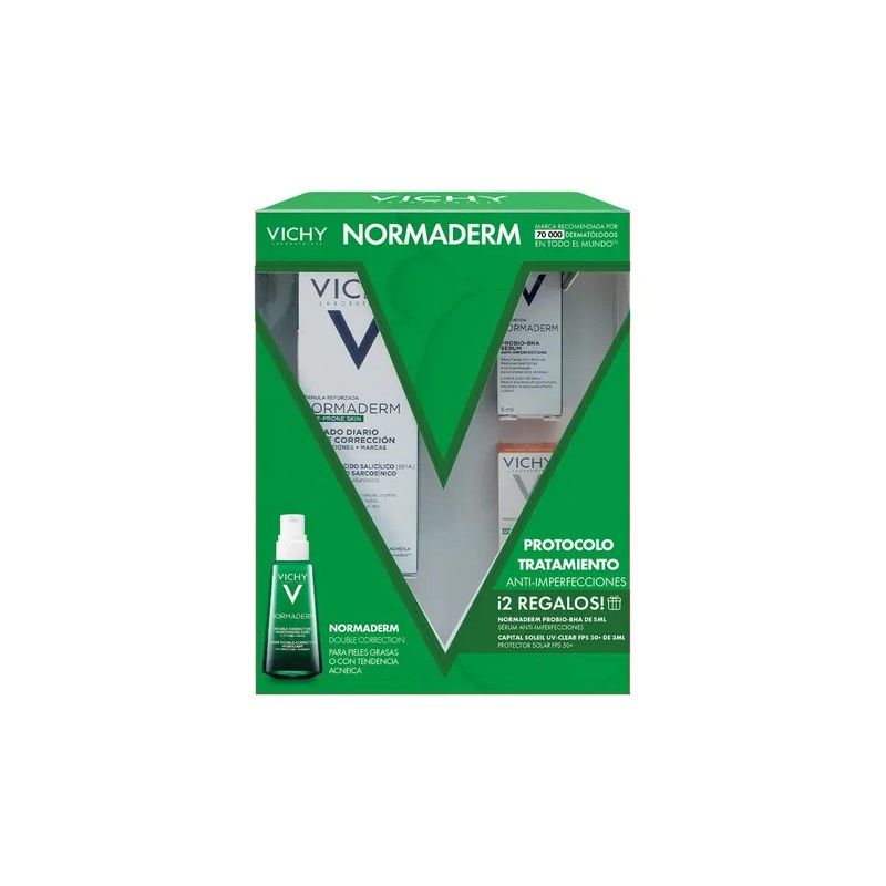 El sérum Normaderm actúa profundamente para reducir la apariencia de poros y mejorar la textura de la piel, mientras que la fórmula Double Correction ayuda a corregir arrugas y líneas de expresión. Además, el protector UV Clear proporciona una defensa esencial contra los daños solares, asegurando que tu piel se mantenga radiante y saludable.