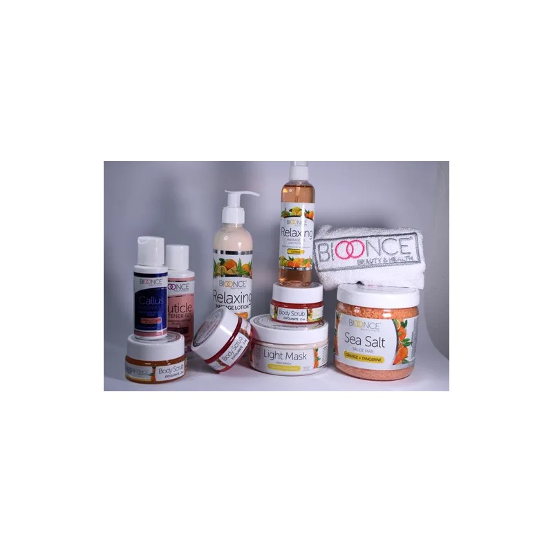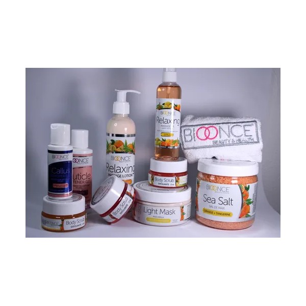 1 Sea Salt 16 oz, 1 Light Mask 8 oz, 3 Body Scrub 2 oz, 1 Relaxing Massage Lotion 8 oz, 1 Relaxing Oil 4 oz, 1 Cuticule Remover 4 oz, Callus Remover 2 oz y toalla mediana. Aromas a elegir. Estuche de vinil y yute.