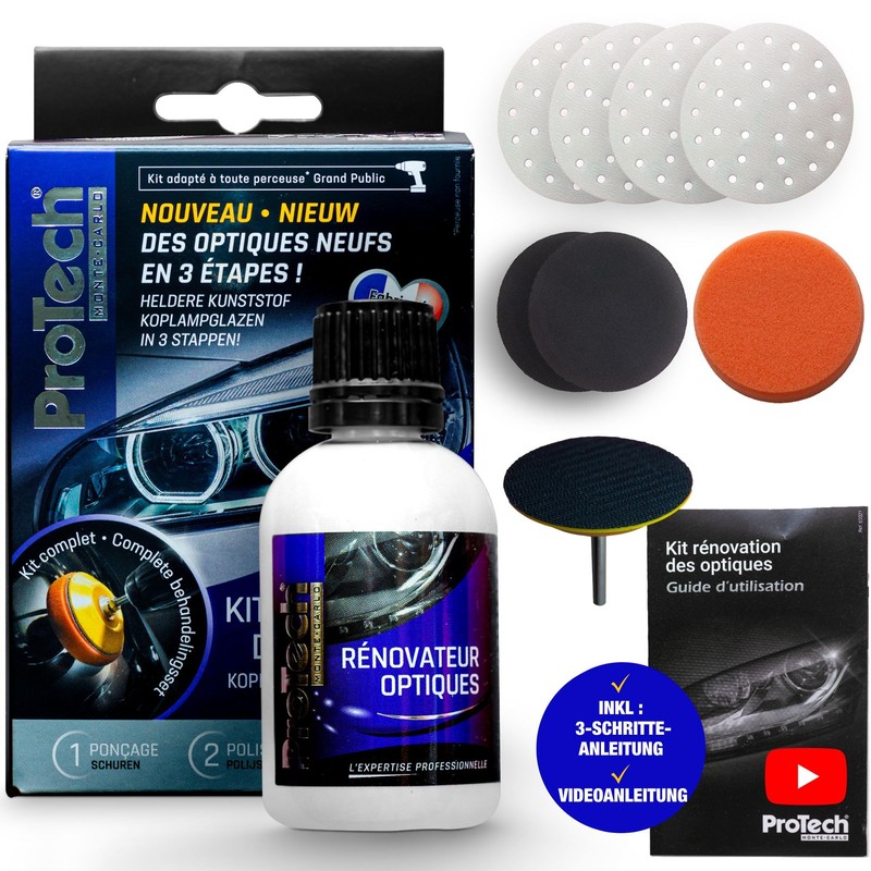 - *PROFESSIONAL HEADLIGHT RENOVATION Get back your original car headlights with the ProTechMC Optics Renovation Kit. A complete polishing kit designed for the complete renovation of your tarnished car headlights, guaranteeing you optimal night vision with a professional result.