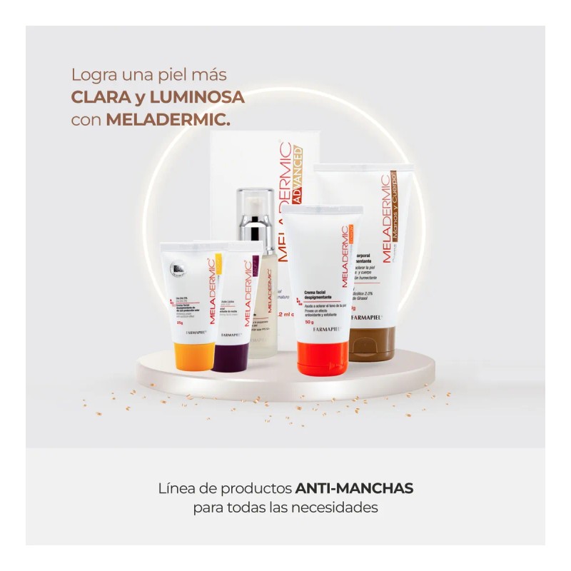 - Recupera una piel uniforme, luminosa y sin manchas con el Pack Meladermic Día + Noche, un sistema dermatológico de tratamiento despigmentante facial 24 horas especialmente diseñado para disminuir manchas, paño, pecas y marcas por acné. Este dúo aclarante combina una fórmula de día con protección solar FPS 20, y una fórmula nocturna con acción exfoliante y regeneradora, ideal para combatir la hiperpigmentación desde la raíz y prevenir la formación de nueva melanina. Apto para todo tipo de piel, incluso sensibles o con intolerancia a la hidroquinona. BENEFICIOS DEL PACK