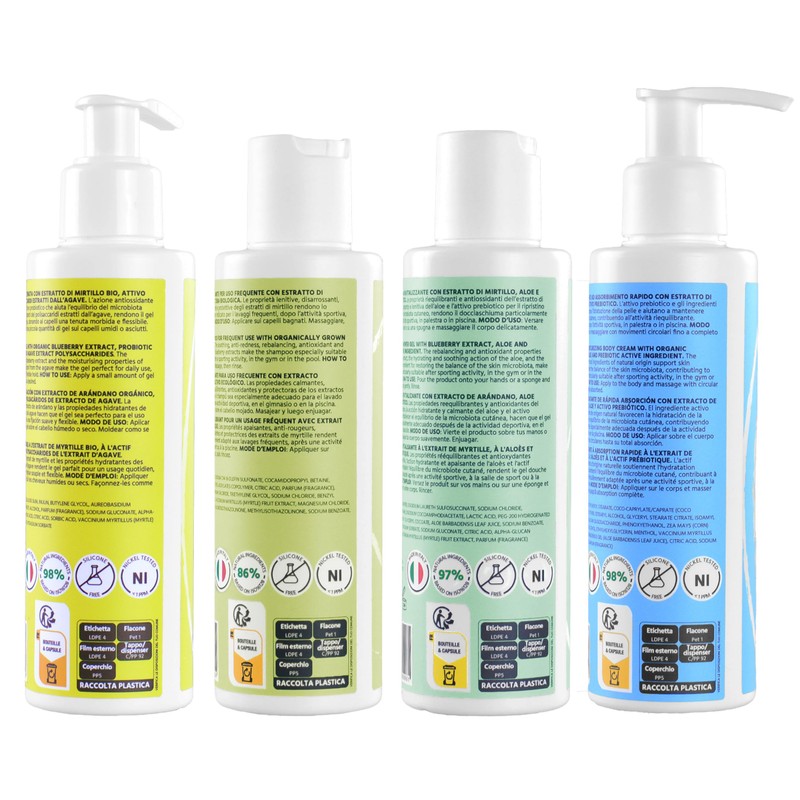 - Specific treatment to care for skin and curly hair after training, specially designed for frequent use even after the gym or swimming pool.