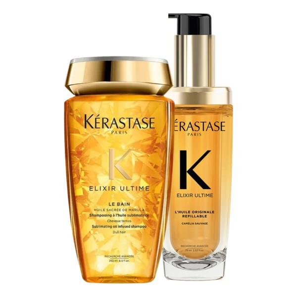 Kit Tratamiento Para Cabello Suave Kérastase Anti Frizz Para Brillo y Suavidad Elixir Ultime Bain 250ml y Aceite lhuile 100ml Hidrata La Fibra Capilar