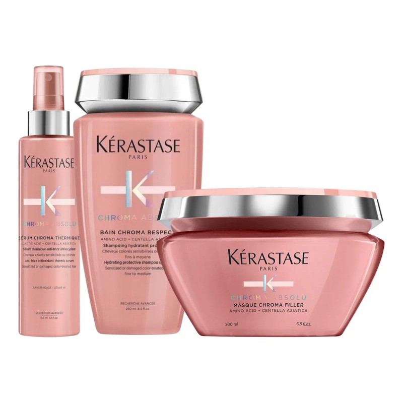 Kit Tratamiento Para Cabello Teñido Kerastase Chroma Absolu Shampoo Bain Chroma Respect Serum Chroma Thermique y Mascarilla Chroma Filler Fortalece la Fibra Capilar