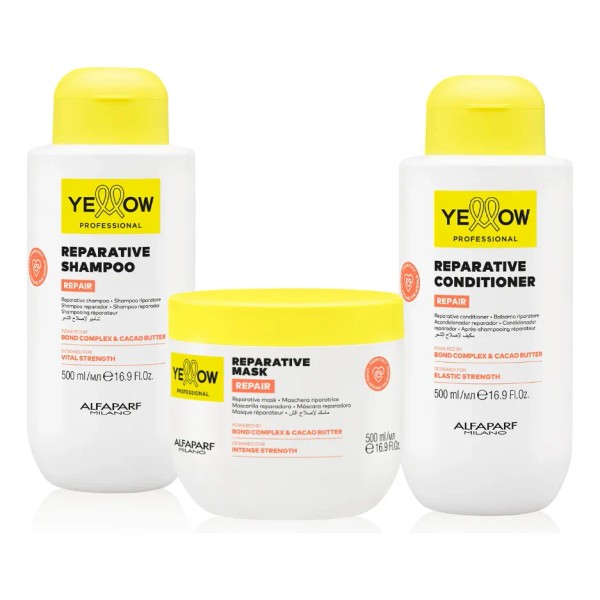 El Kit Yellow Repair es un tratamiento capilar completo formulado para reparar, nutrir e hidratar el cabello dañado o procesado. Este set incluye shampoo, acondicionador y mascarilla con ingredientes activos que actúan desde la fibra capilar, devolviéndole fuerza, elasticidad y brillo al cabello.