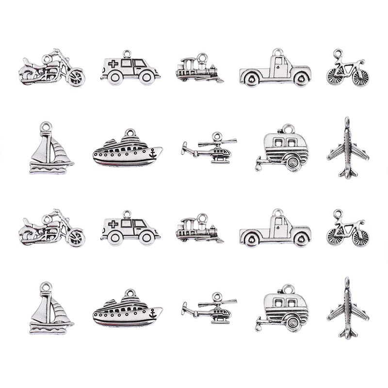 KitBeads 100 Pieces Vehicle Pendants 10 Styles Alloy Motorcycle Ambulance Train Ship Airplane Transport Charms for Jewellery Making