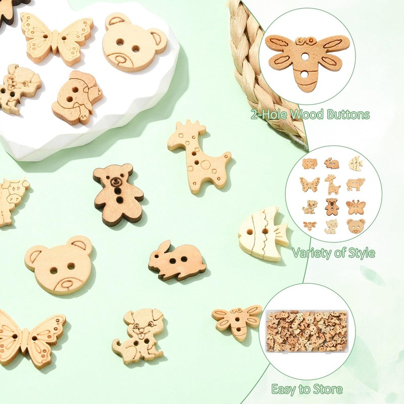 KitBeads 120Pcs 12 Styles Cute Animal Wood Buttons Rabbit Butterfly Bear 2-Ho...