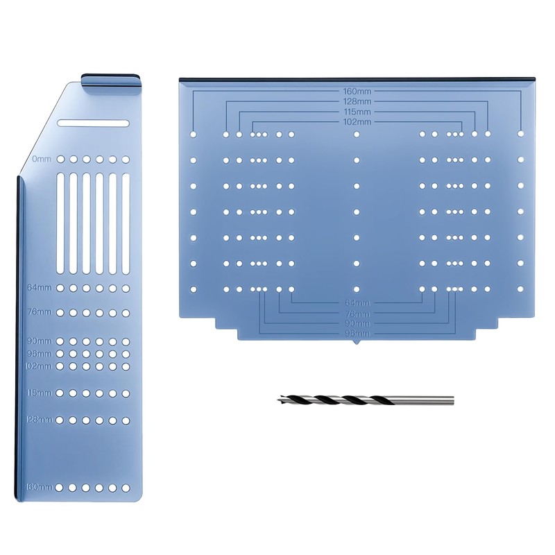 - What's included:1pc cabinet door drilling Template, 1pc Drawer Drilling Template, and 1pc 3/16" Drill Bit.