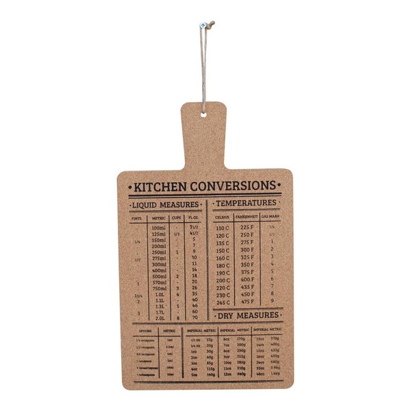 Millilitres, fluid ounces, cups, grams and pints – converting ingredients can be a real nightmare! Make things easy, with this attractive measurement conversion cork board. With full tables for measuring liquids, dry ingredients and temperatures, it’s a lifesaver for any keen baker or cook. Supplied with cord for easy hanging. Approx. 37 x 22.5cm(14½ x 8½”).