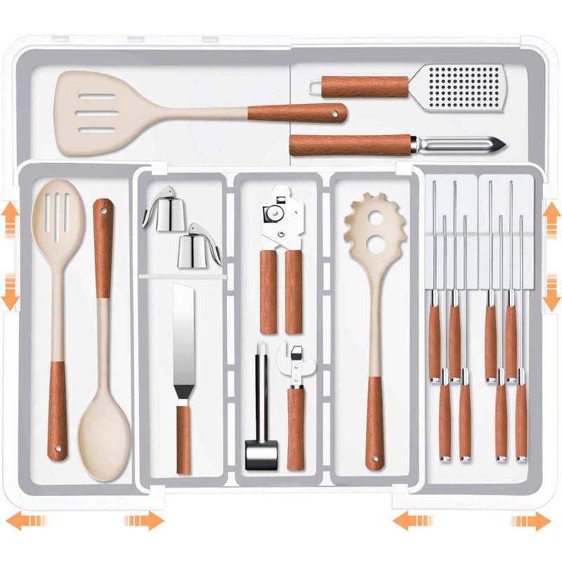Transform your kitchen with the Homecor Large Utensil Organizer, expertly designed to maximize drawer space and keep your utensils neatly arranged. This expandable cooking utensil tray providing versatile storage for spatulas, ladles, tongs, and more.