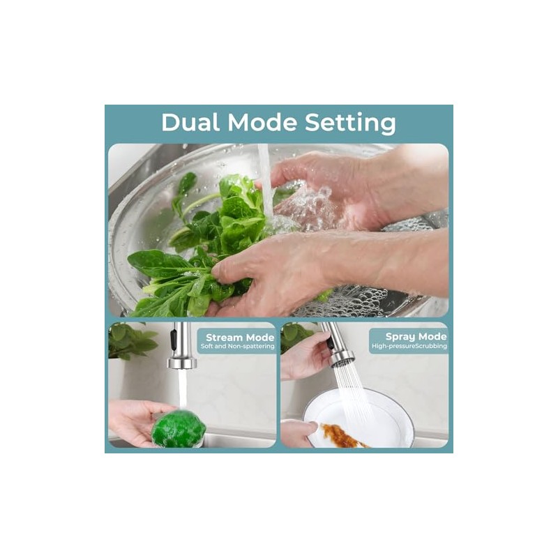 - 2 Function sprayer head: The faucet sprayer offers two spray modes (stream, spray) and features an ergonomic single-handle spring design.
