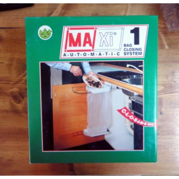 Up for sale is this award winning trash/garbage system used to discreetly store your kitchen waste inside your cabinet. The Maxi Automatic 1 Bag Closing System mounts on the inside of your cabinet door. When you open the door, the automatic system swings the attached plastic trash bag to the open position. After you deposit the trash or garbage into the bag, just shut the cabinet door to automatically pinch the top of the bag together. Repeat until the bag is full, then replace it with a clean bag to start again. This item is the Maxi 1 Bag Auto Closing System that uses one 30 liter trash bag (approximately 8 gallons) and mounts on the inside of any cabinet with a door that is at least 16" (40 cm) in width.
