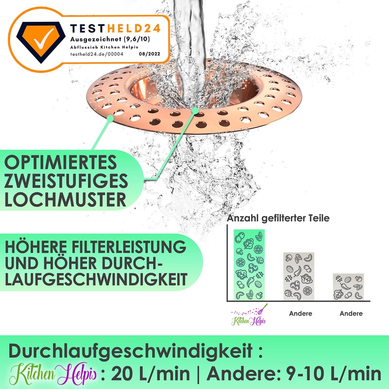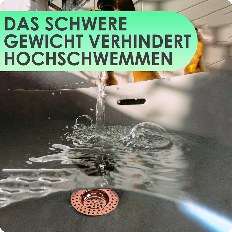 Kitchen Helpis® 2 x Sink Strainer Copper-Coloured Suitable for All Drains, Extra Heavy, 14 g, No Flooding, Made of Rustproof SS304 Stainless Steel, Quick Drain, Strainer for Sink or Hair Strainer