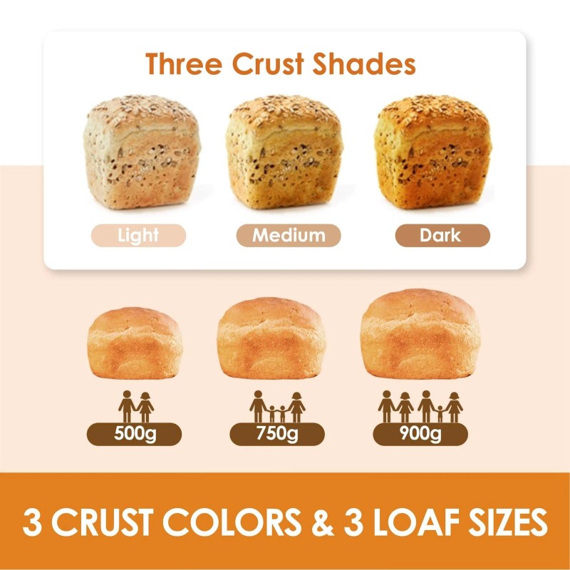 - [15-in-1 AUTOMATIC BREAD MACHINE with 2 LB Large Capacity ] 15 customized automatic programs include 10 Bread Menus (Soft, Sweet, natrual sourdough, French bread, whole-wheat, gulten-free, etc), 5 Non Bread Menus (Cake, Yogurt, Dough...). It has 3 loaf capacity of 1/1.5 /2.0 lb, 3 crust color options in light/medium/dark.