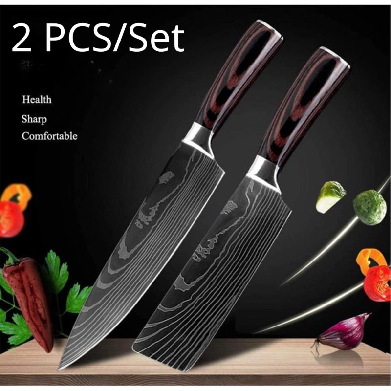 Kitchen Knife Set Japanese Damascus Pattern Stainless Steel 2 Pcs Chef Knives - Red